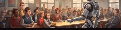 Midjourney: a friendly robot teacher lecturing a class full of human students --ar 4:1 --v 5.1