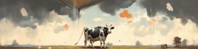 Midjourney: funny, artful, a cow being pulled around by a tornado with a chat bubble saying this is fine --ar 4:1 --v 5.1