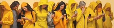 Midjourney: abstract art, a group of social media influencers, but they're all wearing yellow snapchat shirts and on their phones --ar 4:1 --v 5.1
