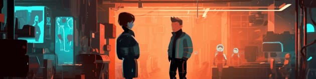 Midjourney: a video game scene where the player is talking to an npc and the npc is plugged into an ai chatbot --ar 4:1 --v 5.1